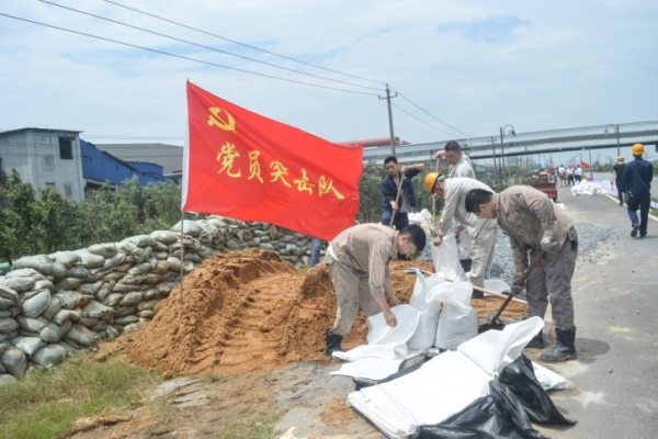 一場防汛築堤保衛戰正式打響。黨旗、團旗在2300餘米的堤壩上迎風飄揚,大家氣勢如虹、幹勁十足。有的幾人一組,一個鏟沙、一個提袋、一個裝沙;有的幾十人排成一條“長龍”,形成一條沙袋“傳輸線”,沙袋在大家手中快速傳遞,運輸到指定地點後,按要求碼放得整整齊齊,迅速築起了一道防汛的“銅牆鐵壁”。