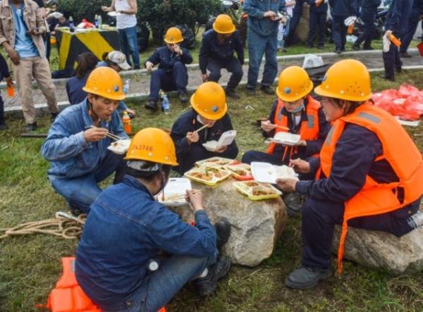 中午時分,該公司食堂為參與防汛築堤的員工送來了工作餐,大家累了就依靠岸邊歇歇腳,餓了就在“陣地”上用餐,全體員工眾誌成城,堅守“陣地”,誓要完成工作任務。