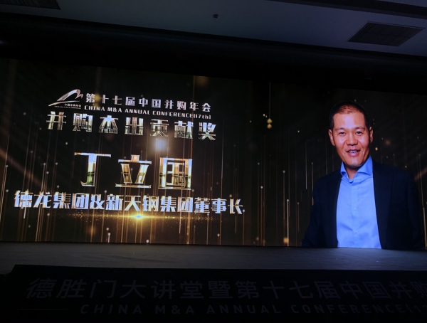 在9月19日召開的德勝門大講堂暨第十七屆中國並購年會上,德龍集團、新天鋼集團董事長丁立國被授予並購傑出貢獻獎。本屆年會由全國工商聯主辦,全聯並購公會承辦。