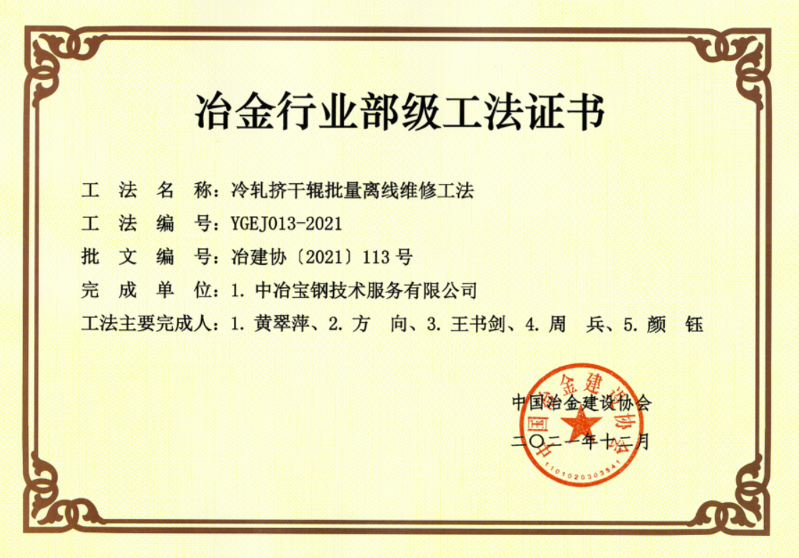 1月14日,從中國冶金建設協會傳來喜訊,中冶寶鋼2021年度申報《冷軋擠幹輥批量維修工法》通過評審,獲得2021年度冶金建設行業部級工法認定證書。