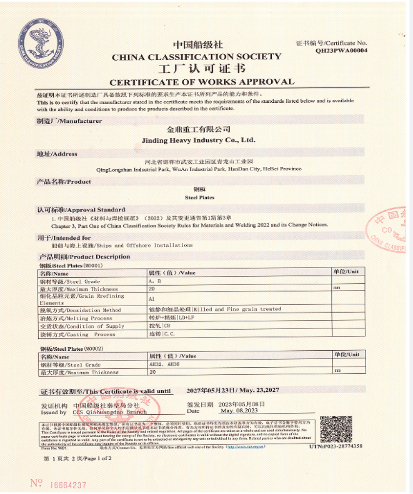 近日,金鼎鋼鐵集團通過了中國船級社對企業船板的現場審核,再次獲得中國船級社的資質認可,並頒發《中國船級社工廠認可證書》,又一次表明“金鼎牌”鋼板滿足國家及船級社相關的規範要求。