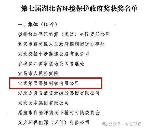 先後榮獲“綠色工廠”“全國節能先進企業”“清潔生產環境友好型企業”“全國綠化先進企業”、國家3A級旅遊景區等榮譽。2023年,鄂鋼獲評為重汙染天氣企業績效評價A級企業,是湖北省第一家被評定為A的鋼鐵長流程企業,得到了集團、地方政府和社會各界的廣泛認可。