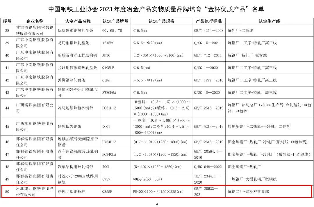 此次,津西申報的熱軋U型鋼板樁產品,通過申報、初審、專業認定、公示等程序,並通過中國鋼鐵工業協會“冶金產品實物質量培育審定委員會”審定,在全國申報企業中脫穎而出,得到專家評審組一致好評。