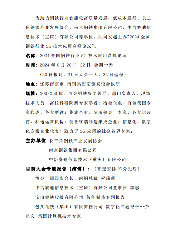 2024年全國鋼鐵行業5G技術應用高峰論壇(二號通知)