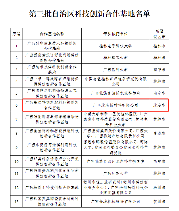 喜訊+2!近日,自治區工業和信息化廳等6部門公布2024年廣西壯族自治區新認定企業技術中心名單,北港不鏽鋼公司獲評;自治區科技廳公布第三批廣西科技創新合作基地名單,依托北港新材料公司建設的“廣西高端特鋼新材料科技創新合作基地”獲認定。