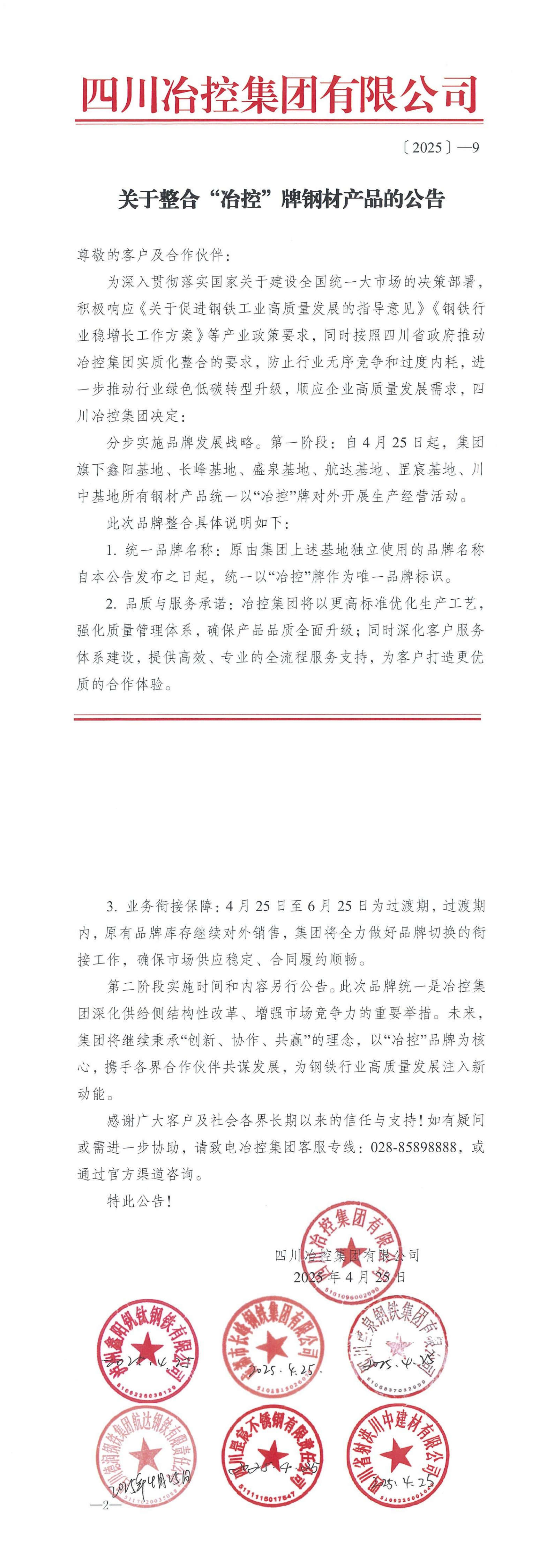 冶控集團關於整合“冶控”牌鋼材產品的公告
