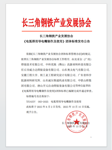 2025年11月1日,經長三角鋼鐵產業發展協會標準化技術委員會組織,中鐵山橋集團有限公司,核工業工程研究設計有限公司,賓采爾(廣州)焊接技術有限公司,安徽工程大學,任丘市威力達焊接設備有限公司,山東奧太電氣有限公司,中科優極(佛山)gaoxincailiaokejiyouxiangongsi,guangdongshengkexueyuanxincailiaoyanjiusuo,shandongweiersitongwuyeyouxiangongsi,jiangsukejidaxue,zhongguokuangyedaxue,zhongguohuaxuegongchengdishisijiansheyouxiangongsi,zhongjianganggoujiangsuyouxiangongsi,zhongtiebaoqiaojituanyouxiangongsi,jixiegongyexinxiyanjiuyuan,tangshankaiyuanzidonghanjiezhuangbeiyouxiangongsi,nantongzhenhuazhongxingzhuangbeizhizaoyouxiangongsi,xingtailuqiaoqianshanqiaolianggoujianyouxianzerengongsi,jinggonglvzhukejijituanyouxiangongsi,guangdongweiertaikekejiyouxiangongsi,shanghaihugonghanjiejituangufenyouxiangongsi,shandongdaxue,xianjiaotongdaxuedengdanweizhuanjiaxuezhegongtongcanjiabianzhi,zhidingde《電弧焊用導電嘴製作及使用》團體標準(T/DASV 003—2025)正式實施。