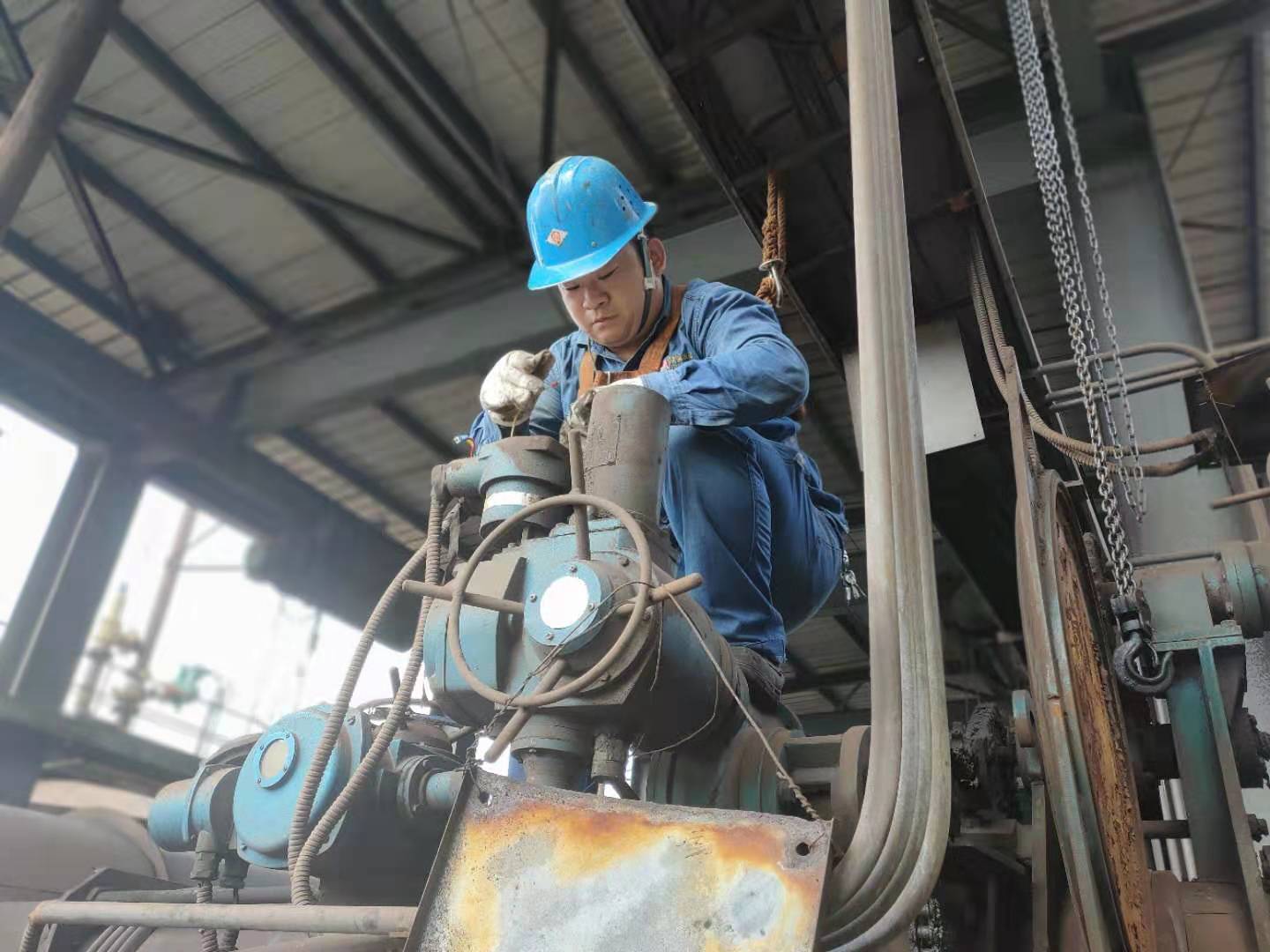 煉鐵工段兩名年輕的維修人員,正在對K9皮帶的電機進行維護,緊固螺絲、清灰,細微的工作從不馬虎,藍色安全帽下是他們一絲不苟的專注眼神。