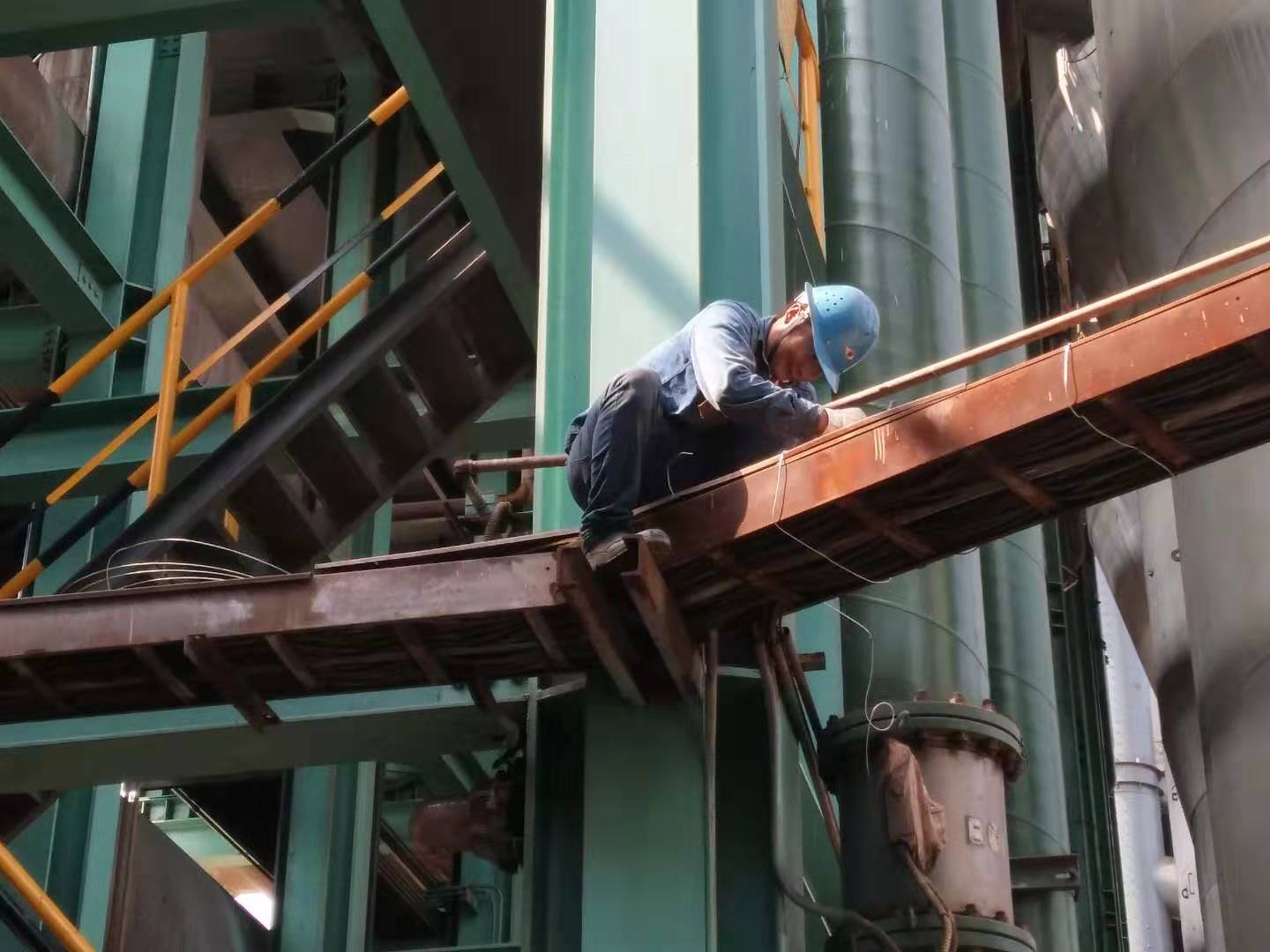 近乎趴在橋架上的姿態,是把“繡花”的功夫用在了作業過程中。這是檢修人員敷設1#熱風爐煤氣、空氣、煙氣預熱器前後測溫點的電纜的一幕。