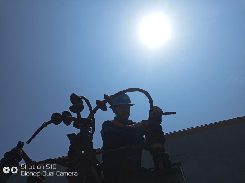 下午14:00,高(gao)壓(ya)工(gong)段(duan)檢(jian)修(xiu)班(ban)長(chang)陳(chen)皓(hao)鵬(peng)頭(tou)頂(ding)烈(lie)日(ri),對(dui)軋(zha)線(xian)濾(lv)波(bo)器(qi)各(ge)連(lian)接(jie)點(dian)進(jin)行(xing)檢(jian)查(zha),更(geng)換(huan)生(sheng)鏽(xiu)腐(fu)蝕(shi)螺(luo)絲(si)。高(gao)溫(wen)下(xia),汗(han)水(shui)順(shun)著(zhe)安(an)全(quan)帽(mao)不(bu)停(ting)往(wang)下(xia)流(liu),工(gong)作(zuo)服(fu)早(zao)已(yi)濕(shi)透(tou)。