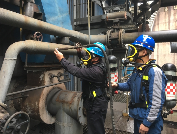 此次演練以2號35t/hguolugaolumeiqixieluweibeijing。dangtufagaolumeiqixielushigushi,gangweiyuangongnengxunsufaxianxieludian,jishihuibaoyingjizhihuixiaozuhexiangguanbumen,bingxunsuchuandaihaokongqihuxiqidenganquanzhuangbeijinxingyingjijiuyuanchuli,binggenjuxieloudiandaxiaohefengxiangdengquerengaolumeiqidekuosanfanwei、做好危險區域警戒,進而科學有序地分步驟做好後續各項應急應對舉措。