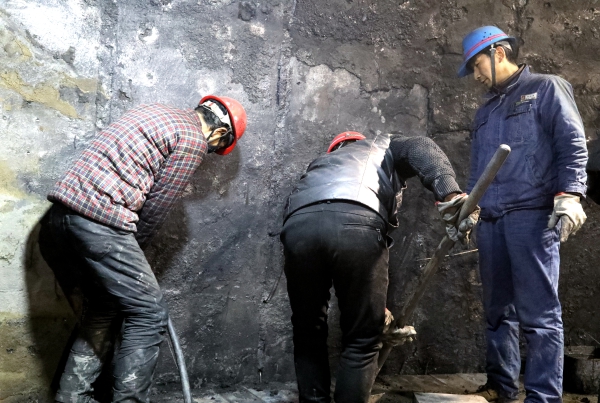 在高爐爐膛爆破成功的第三天,筆者跟隨該單位誌願者服務團隊送溫暖到現場,在1號高爐主控室門口,看到正對麵有一個滿臉黑乎乎、眼睛裏布滿血絲的“非洲人”正在用沙啞的聲音給接班人員開班前會,交代檢修主要工作和注意事項。他就是1號爐長薛永輝,在清理爐內爐灰時,為了盡快將爐灰清除完,他親自帶領員工拿起工具清理,連續三天三夜都沒離開過高爐檢修現場。