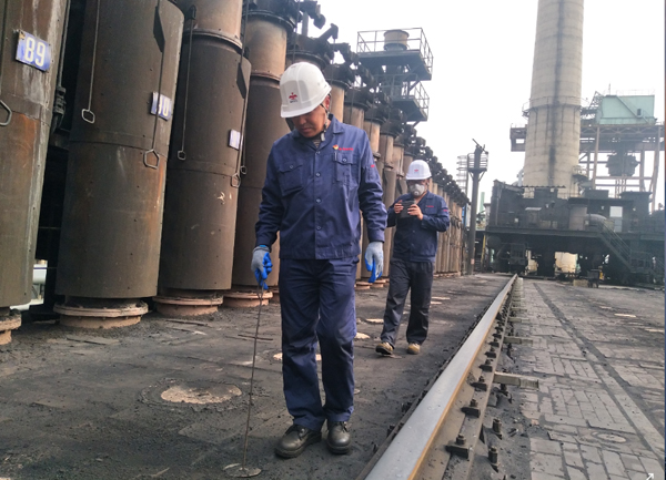 張軍(前)正在測量焦爐燃燒室溫度。 (張宏偉 攝)