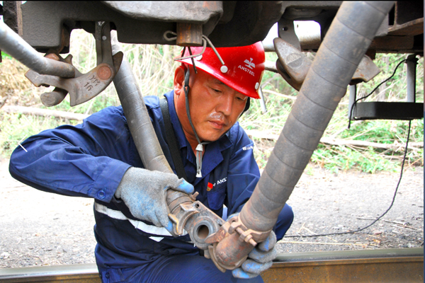jinliduoshianshangangtietieyunfengongsiyunshuzongzhanbeibuzhandeyimingtiaochegong,genzhetadejiaobuzoujinanganggufendaxingchangdechanxian,zhiganjiaoyigurelangshunjianxilai,youzhongkuaizhixideganjiao,chanxianpangdewendudayueyou50攝氏度。金立鐸此刻的工作是需要牽引6節滿載坯料的車廂運輸到另一條產線。“這樣的活兒不僅要求安全、平穩,還得爭取時間,不能因為我們而耽誤了產線的生產進度。”話還未停,他已經開始對一組車廂的輪對進行檢查了。