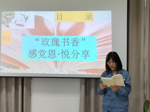 第三部分,9名女職工選讀了“玫瑰書香”主題閱讀活動推薦書目《論中國共產黨曆史》《習近平新時代中國特色社會主義思想學習問答》《中國共產黨簡史》等黨史文章,並分享了各自的心得感悟,贏得台下陣陣掌聲。