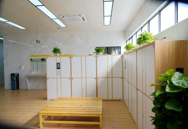 韶鋼鋼後浴室建築麵積約500m²,設有男浴位60個、女浴位10個。配備洗衣智能收發衣櫃200個。每天最大容量可供約600人使用(分3場)。浴室外由舊備件構成“100”字樣,彰顯此項目是向慶祝建黨100周年的獻禮。男浴室內設70個人臉識別智能儲物櫃,安裝觸摸感應電加熱防霧鏡2麵,女浴室內設15個人臉識別智能儲物櫃,安裝觸摸感應電加熱防霧鏡1麵。