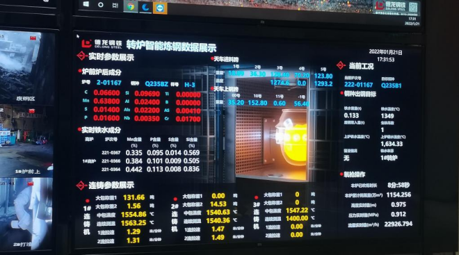 隨後,他向小分隊介紹起了身後的轉爐智能煉鋼數據中控項目。德龍鋼鐵作為國家環保A級企業,全國首家在生產鋼鐵企業國家4A級旅遊景區,國家高新技術企業,已經成為行業的環保標杆企業!2022年德龍集團公司定位為“變革年”,成立智能製造推進工作領導小組,主攻生產工序數字智能化升級和改造,梳理出“3D”髒、累、險崗位,開展縱向到邊、橫向到底優化升級,全力推進智慧管控“567”中心建設,力爭實現“雙標杆”!而煉鋼智能中控項目的靈感來自於2021年建成的智能環保管控中心項目,大屏上通過對各環保六參數監測微站(PM10,PM2.5,SO2,NO2,CO和O3)進行成像顯示,全廠區45個監測微站實現了集動態監測、數字管控、全域比對、圖文成像於一體,形成了數字化智能環保管控中心,成為環保管理的重要措施和抓手,獲得市、區環保部門的一致好評。
