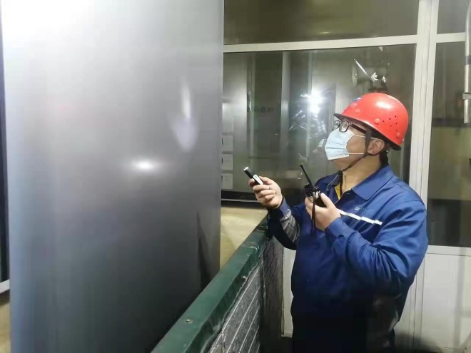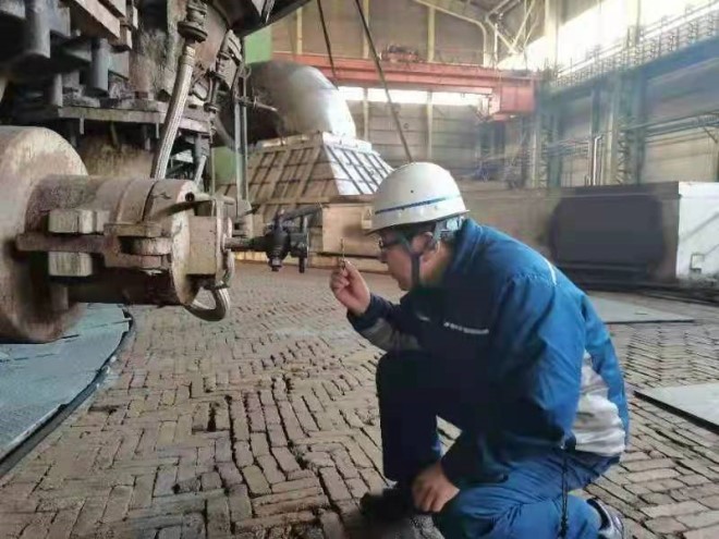 十幾分鍾後,第一卷到達檢查站。早就等在這裏的質檢員張書青拿著手電對帶鋼表麵進行檢查。