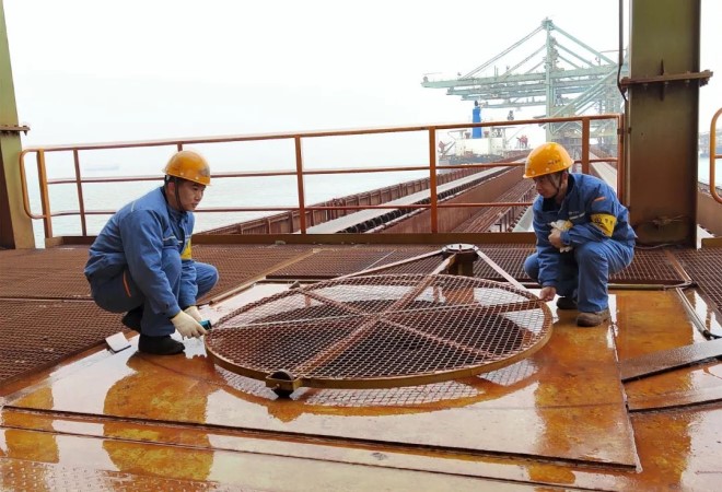 李偉偉與同事檢查碼頭設備