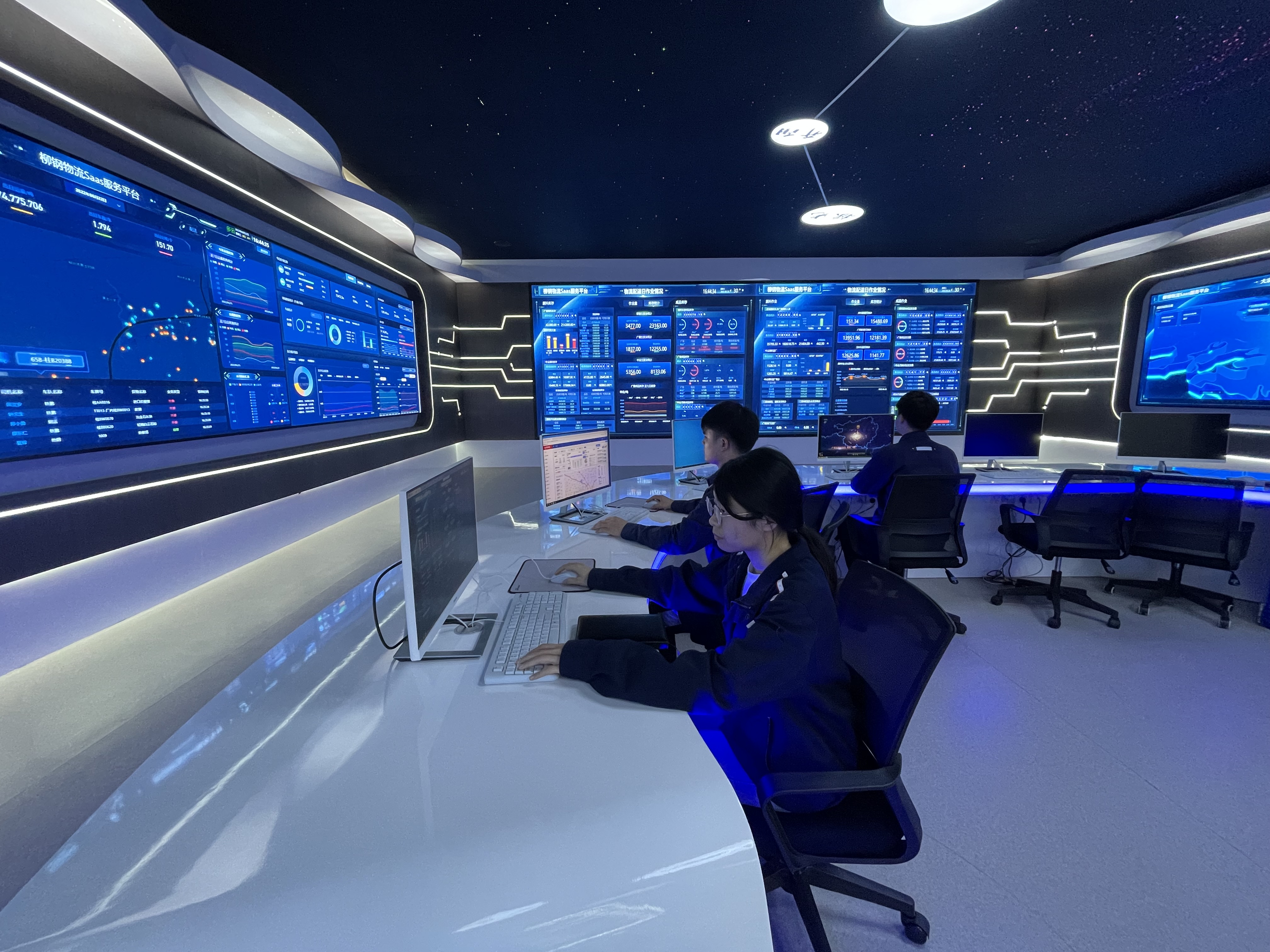 調度中心三麵環繞的大屏上顯示著實時的車輛運輸信息,車輛定位、實時路況、當天運量等等數據在屏幕上跳動變化,科幻而壯觀。