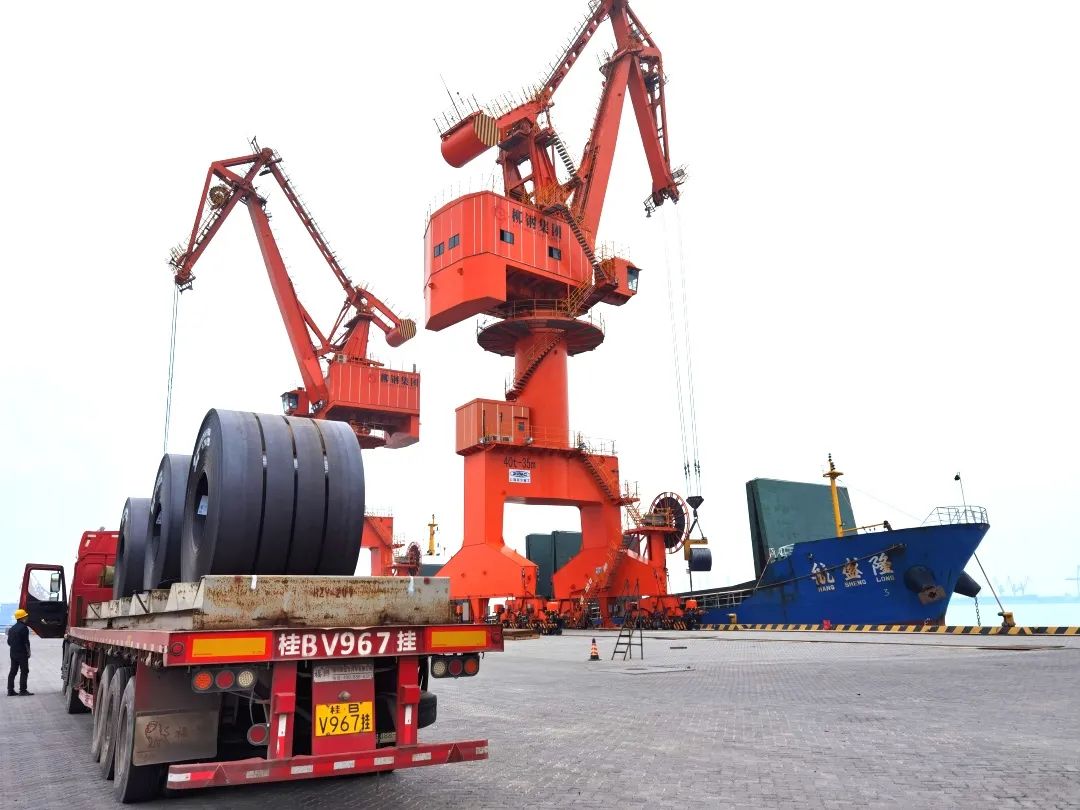 防城港廣西鋼鐵基地萬噸碼頭調運現場,拉運成品鋼材的卡車往來不絕,或運送鋼材出入,或停車排隊等待吊裝。幾台行車、吊機協同作業,低沉的機器轟鳴聲和指揮行車的哨聲交織在一起,像是在協奏激昂的生產交響曲。