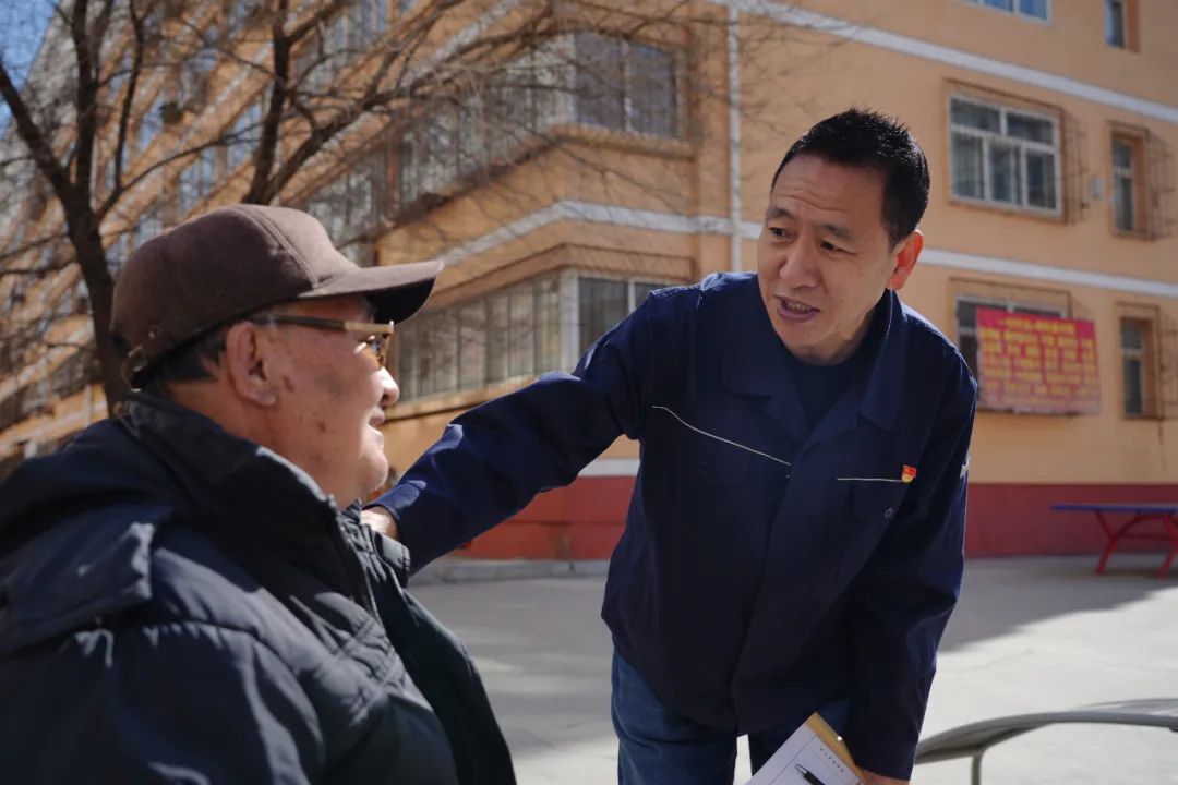 圖為蘇誌軍正在詢問住區老人身體情況。石成棟/攝