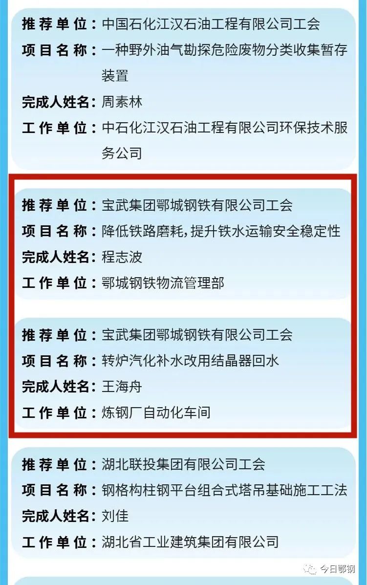 剛剛,2023年全省職工百優“五小”成果名單公布。鄂鋼煉鋼廠王海舟的創新成果《轉爐汽化補水改用結晶器回水》和物流管理部程誌波的創新成果《降低鐵路磨耗,提升鐵水運輸安全穩定性》評選為2023年全省職工百優“五小”成果。