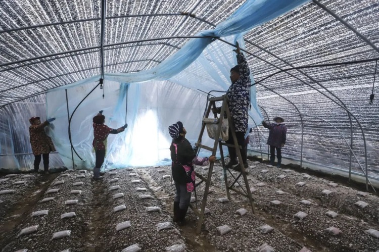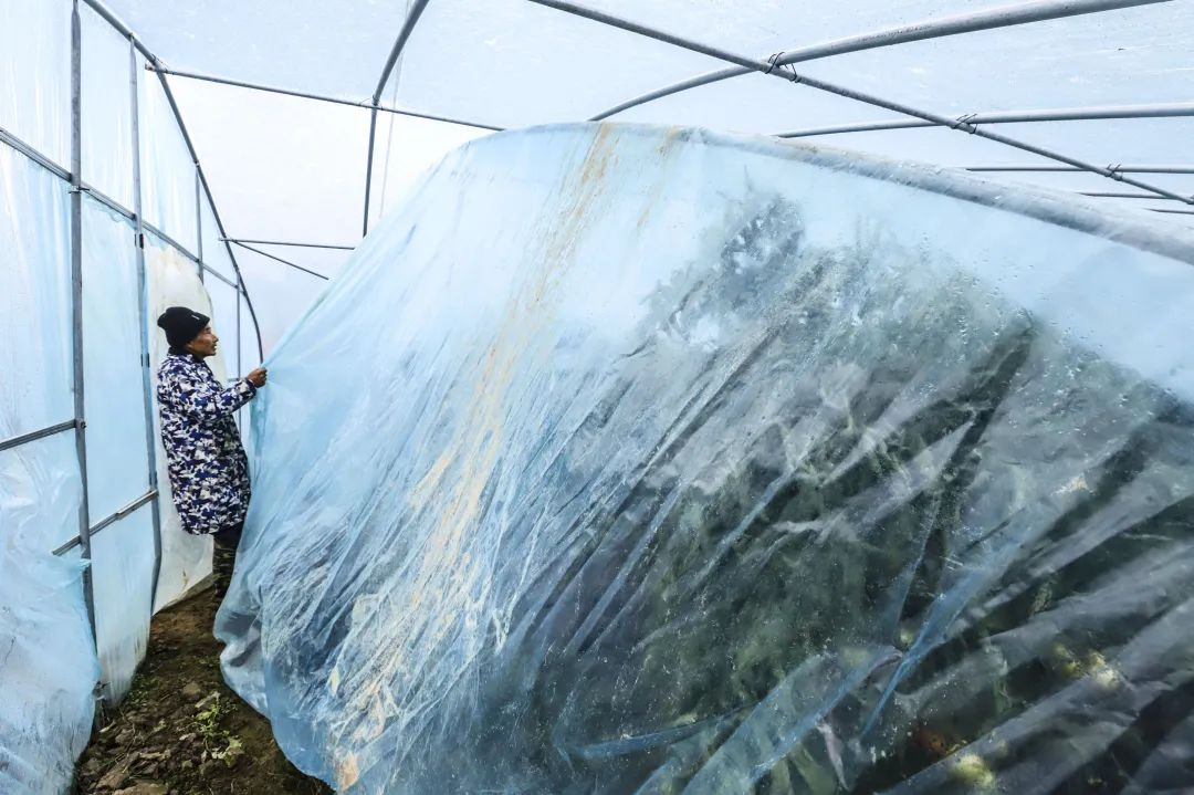 就業的脫貧戶正在為大棚加蓋保溫膜
