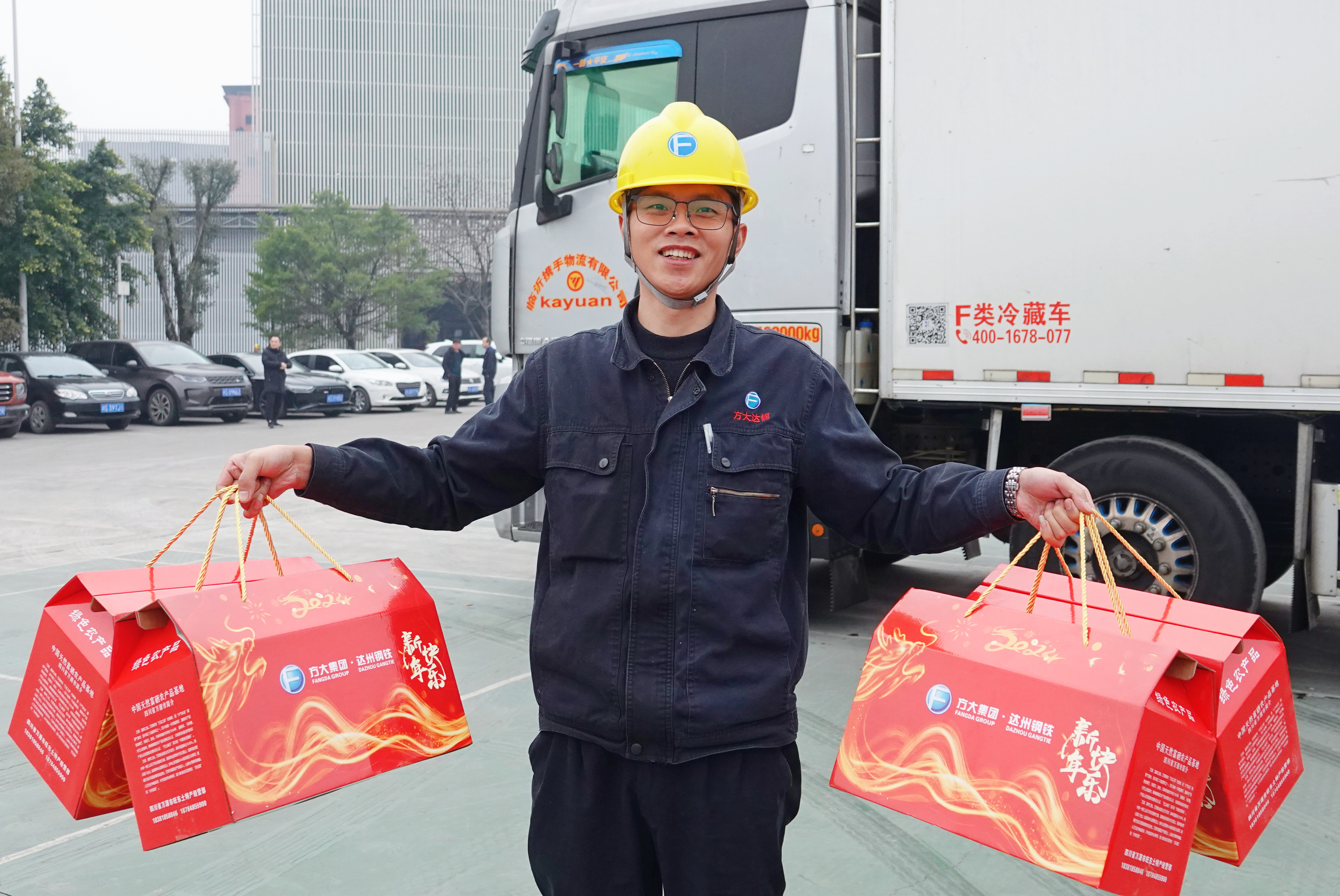 1月31日,達州鋼鐵廠區幸福笑臉持續綿延,一輛輛滿載羊肉、牛肉及腐竹等福利品的大貨車駛入發放點,各個單位的員工們紛紛來到分發點,大家齊心協力將一箱箱、一盒盒福利品進行下車堆碼、分發,現場一派熱鬧景象。