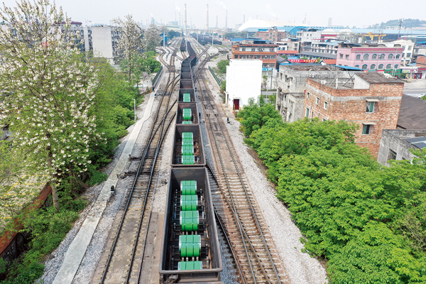 圖為滿載柳鋼鋼卷的列車駛出廠區發往目的地。