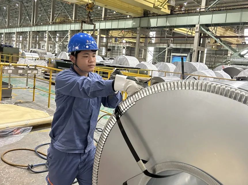 外麵爆竹聲聲響,湛江鋼鐵的生產現場仍然熱火朝天、井然有序。來自中冶寶鋼第四分公司的包裝工隊伍正在對鋼卷進行來料質量檢查,他們用卷尺一個個測量規格,完成包裝並入庫。賴幸語作為1550彩塗甲班離線包裝班組的一員,主動請纓春節在崗值守,為離家較遠的員工提供回家團圓的機會。“一年365天,我都可以回家,讓其他同事回家吧。”賴幸語說。值班期間,中冶寶鋼緊急接到一批特殊出口材料的包裝任務。為了保障包裝工序順暢,賴幸語積極溝通、主動協調,確認包裝方式、明確包裝工藝,高效完成100多噸出口鋼材包裝任務,讓這個春節更加意義非凡。