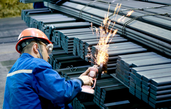 圖為八鋼軋鋼廠員工正修磨產品外觀。