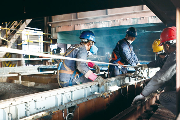 圖為檢修人員安裝金屬式自潤滑燒結機台車滑道密封裝置。