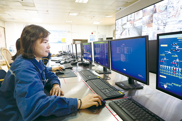 圖為燒結機主控工在電腦屏幕上查閱燒結機生產過程中的含氧量。