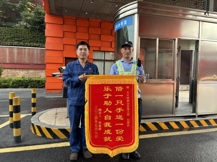 “感謝你們的幫助,幫我們找到了走失的父親!”5月10日上午,方大特鋼煉鐵廠高爐事業部員工蔣春露將一幅印有“借一隻手送一份愛,樂於助人自我成就”的錦旗送至該公司治安保衛部,向該部門員工劉勇兵熱情相助送回其走失父親的善舉表示感謝。