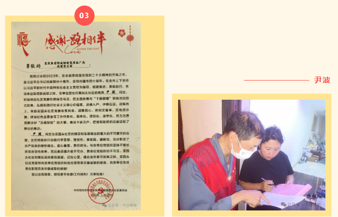作為一名黨員,尹波積極響應社區號召,熱心參與社區各項誌願活動。進樓入戶為居民協調解決問題,社區“學雷鋒”、小區門前“四包”、打掃小區衛生、鏟雪除冰等,到處可見他的身影,流動的紅色馬甲,讓愛心善意凝聚,帶給大家信賴和溫暖。