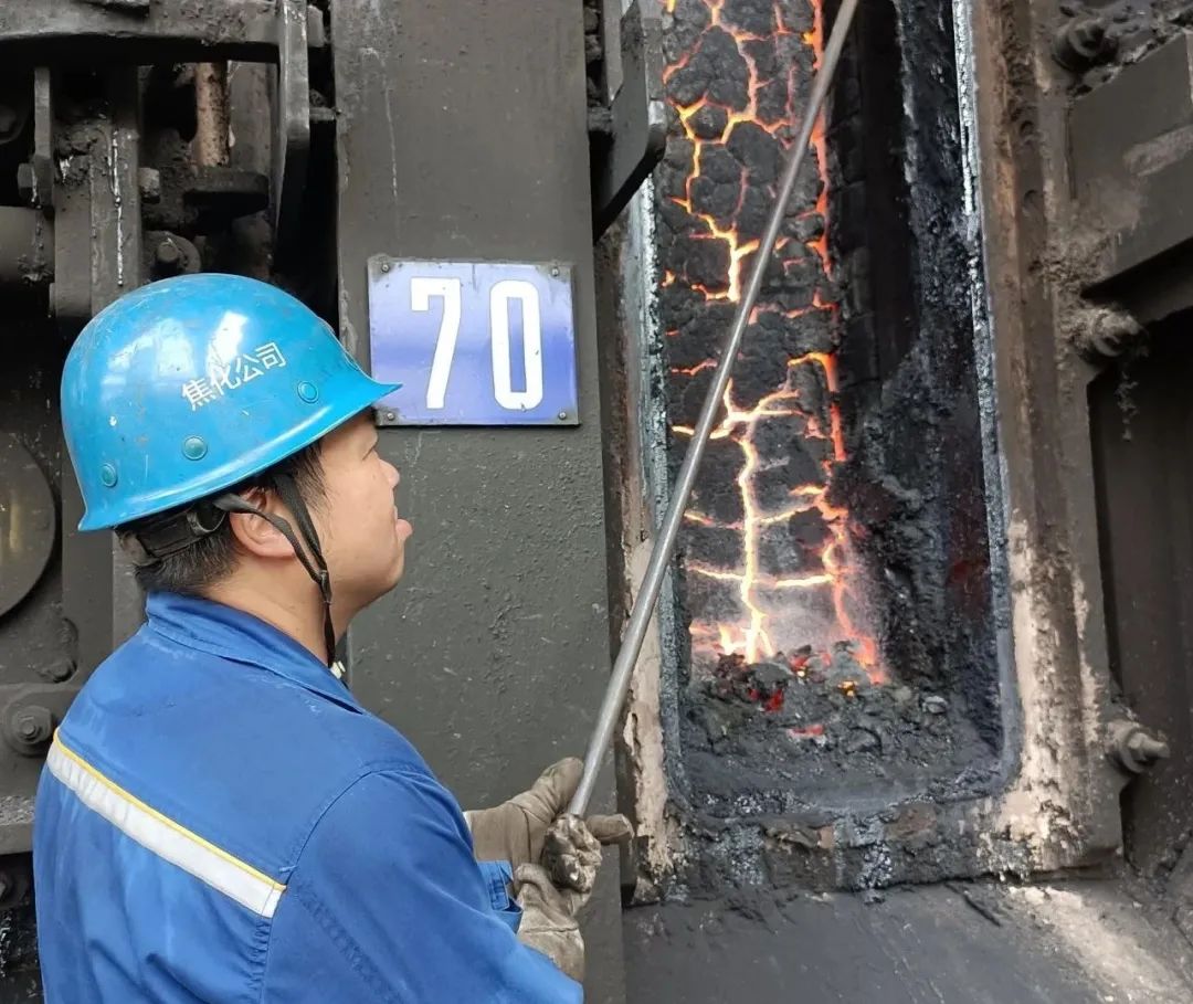 一名煉焦工正迎著爐膛的高溫,進行著爐頭焦的清理工作,“蒸”戰高溫,他絕不服“暑”。(熊豔 攝)