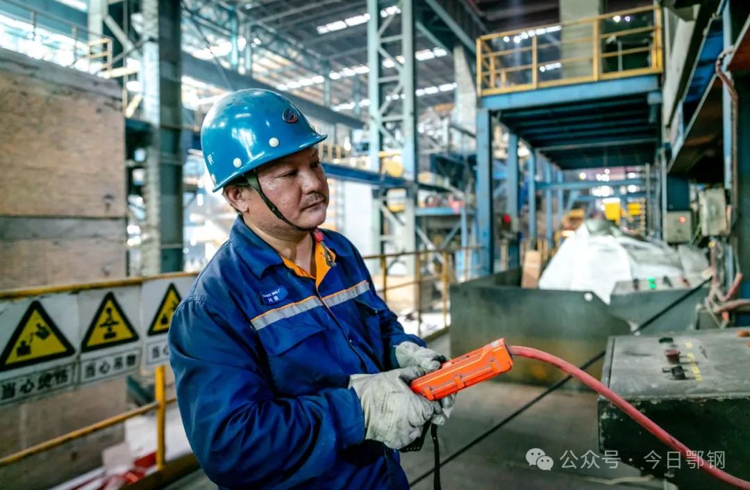 鋼軋廠煉鋼車間職工徐豔民在清理爐台雜物 。(桂多 攝)