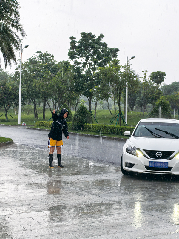 圖為湛江鋼鐵應急分隊成員指揮車輛有序躲避台風。