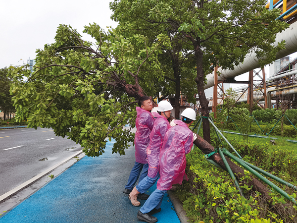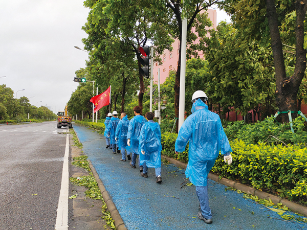 圖為湛江鋼鐵青年突擊隊成員處理被台風吹倒的樹木。