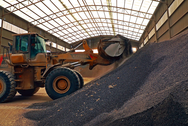圖為該公司一線工人在鋼渣、水渣等固廢料場鏟運生產原料。