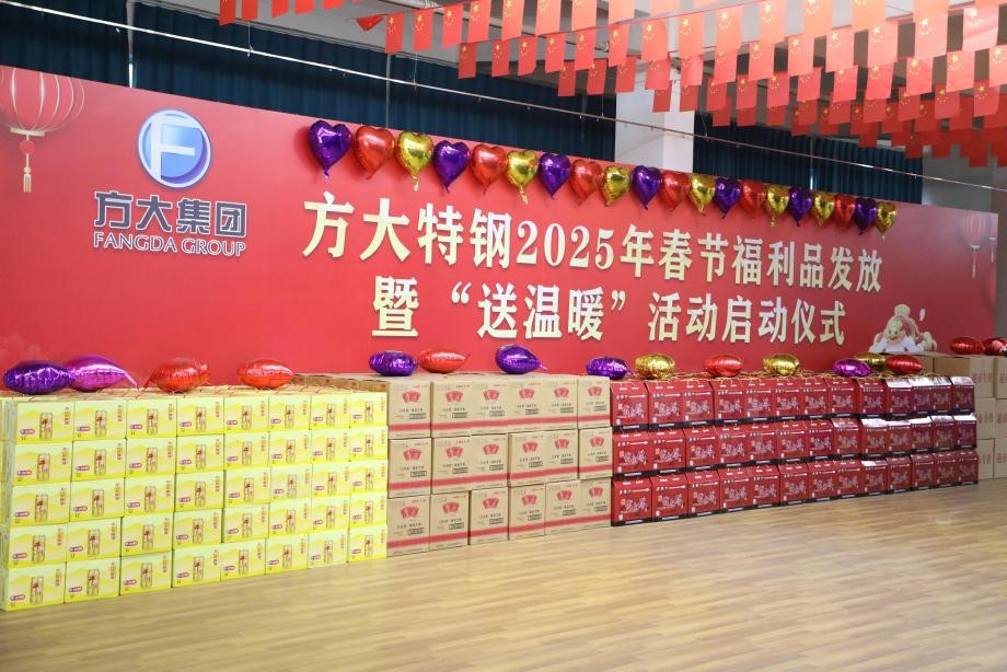 1月20日上午,方大特鋼在職工活動中心隆重舉行2025年春節福利品發放暨“送溫暖”活動啟動儀式。該公司此次春節福利品包含牛肉、羊肉、腐竹、墨魚和食用油,其中牛肉、羊肉和腐竹均為該公司在甘肅省臨夏州東鄉族自治縣的鄉村振興企業生產,在關心關愛員工、精準幫扶該公司建檔員工及家庭的同時,積極助力鄉村振興工作發展。(徐加平)