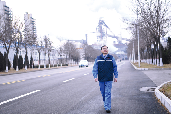 圖為郭佳寧行走在首鋼京唐公司廠區道路上。