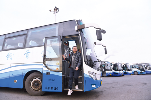 隨著跨省通勤班車路線的增多,郭佳寧(右一)等跨省通勤職工的生活也更加便利。他往返京冀的周期從12天縮減至了7天。圖為郭佳寧和同事們從首鋼京唐公司返回北京。