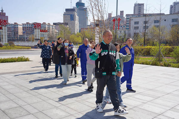 圖為職工家屬參觀本鋼百年曆史的中央廣場後合影留念。