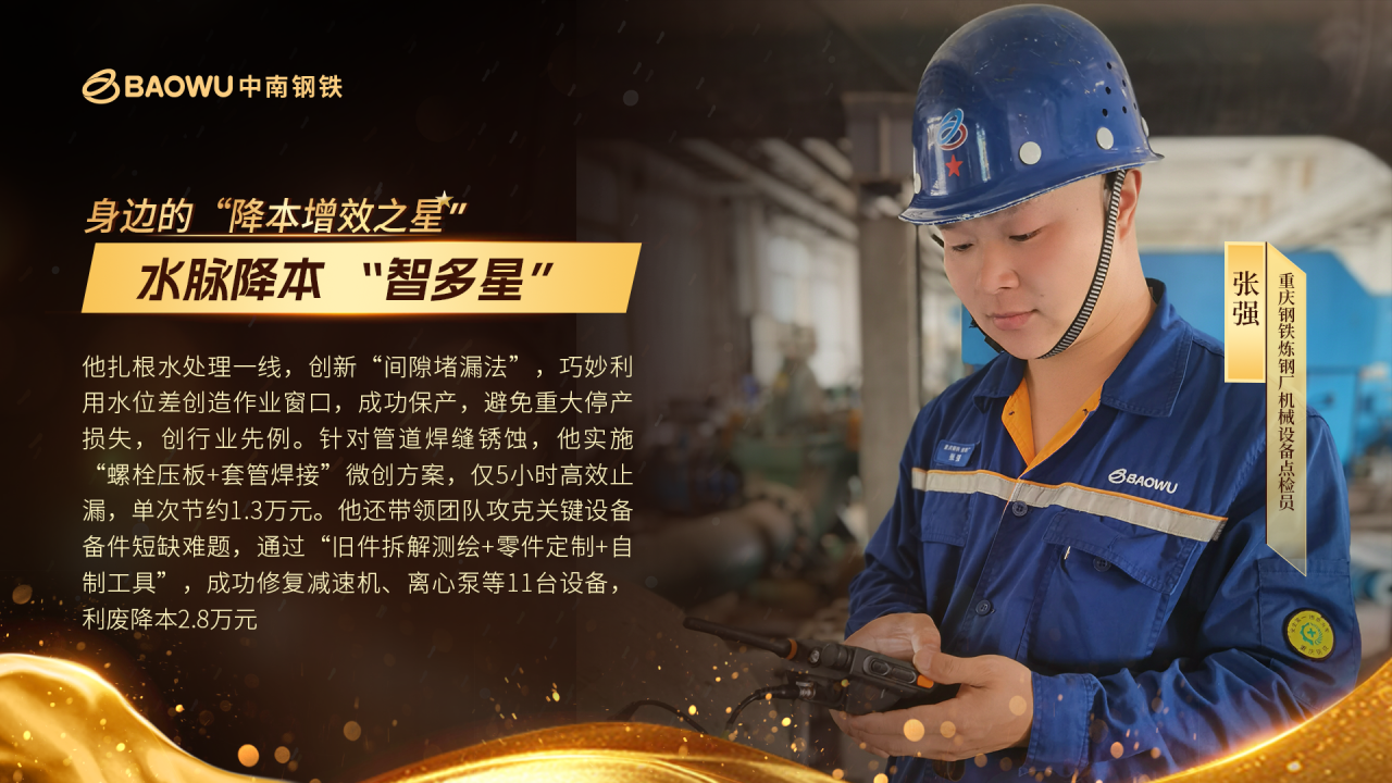 在中南鋼鐵全力衝刺“噸鋼降本增效170元”目標的關鍵時期,重慶鋼鐵煉鋼廠公輔車間機械設備點檢員張強秉持“一切成本皆可降”的理念,深耕水處理設備維護一線,他以設備搶修、技術創新、修xiu舊jiu利li廢fei為wei戰zhan場chang,深shen挖wa內nei潛qian,破po解jie設she備bei頑wan疾ji,用yong堅jian守shou與yu智zhi慧hui踐jian行xing著zhe降jiang本ben增zeng效xiao的de責ze任ren擔dan當dang。今jin天tian,讓rang我wo們men走zou進jin煉lian鋼gang廠chang,一yi起qi聽ting聽ting張zhang強qiang的de降jiang本ben故gu事shi~~