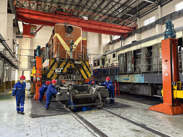 圖為傳動班職工正在把待修的火車頭推入檢修區域。