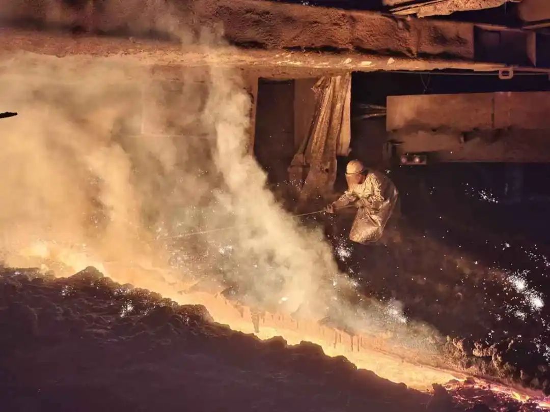 盛夏,驕陽把天空烤成熾白,空氣像被拉緊的鐵絲,滾燙得幾乎能聽見“滋滋”聲。1500℃的鐵水在高爐裏翻湧,重慶鋼鐵公司煉鐵事業部高爐爐台前一群“銀甲”戰士——防護服在熱浪中閃著金屬光——正與鐵花共舞。