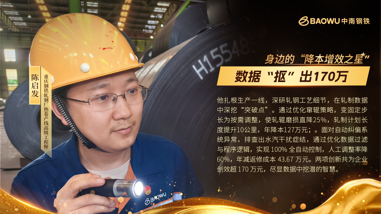 在重慶鋼鐵軋鋼廠熱卷產線,高級工程師陳啟發是個“另類”——他的“辦公室”常在現場。他紮根一線,與操作工並肩作戰,將目光鎖定生產實際,以“崗位創新”為犁,深耕鋼鐵軋製的沃土,硬是從龐雜數據中“淘”出真金白銀,將降本增效鍛造成沉甸甸的效益。今天,讓我們走進軋鋼廠,一起聽聽陳啟發的降本故事~~