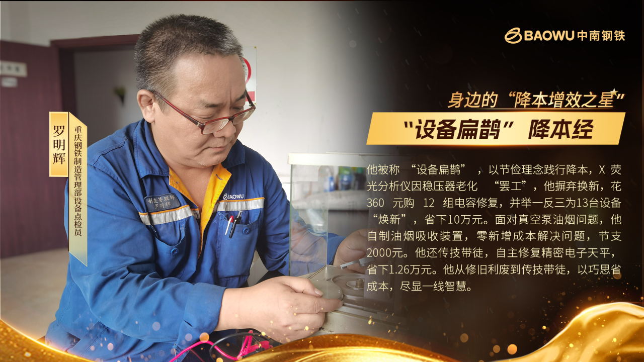 拿著萬能表排查配電箱時,羅明輝的眼神總透著股執拗 —— 這位同事口中的 “設備扁鵲”。生活裏節儉到工裝洗得發白也不換,對待車間裏的設備 “老夥計”,卻有著物盡其用的別樣 “大方”。“讓每台設備都發揮最大價值,才是真降本”,這份樸素信念,成了他在一線啃下成本硬骨頭的底氣。今天,讓我們走進重慶鋼鐵製造管理部,一起聽聽羅明輝的降本故事~~